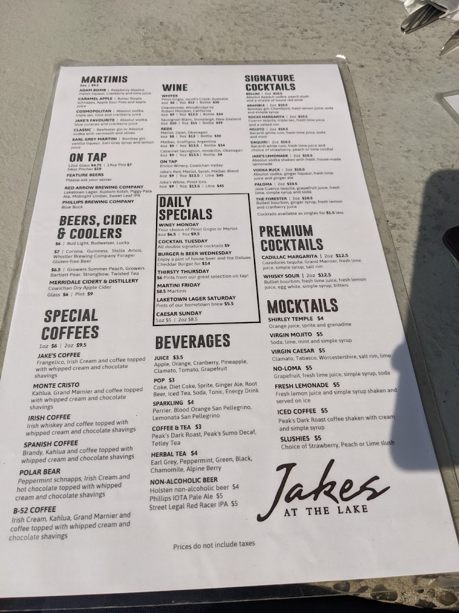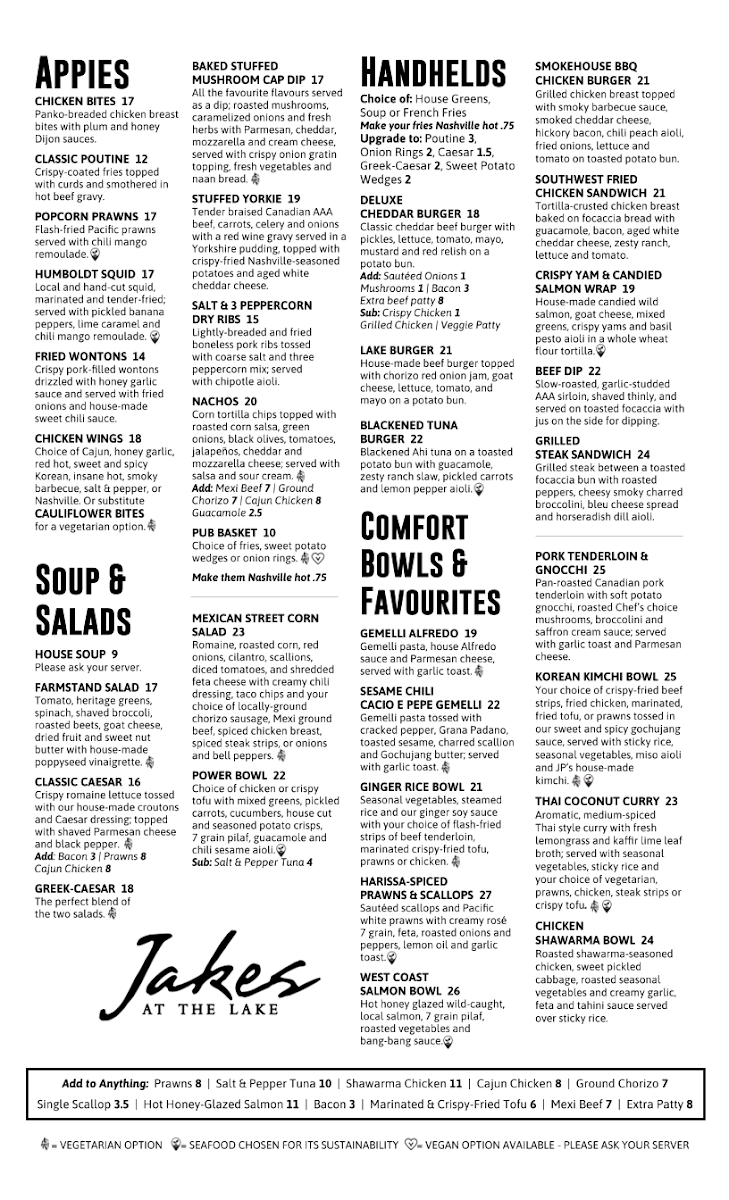 Jakes at the Lake offers a menu that blends casual comfort with a touch of lakeside refinement. You’ll find a variety of approachable dishes designed for sharing or savoring solo, from classic pub bites like poutine and nachos to heartier options such as prime rib beef dip and Cajun chicken penne Alfredo. Fresh, locally inspired choices including candied salmon wraps and farmstand salads create a balanced experience that suits different tastes.